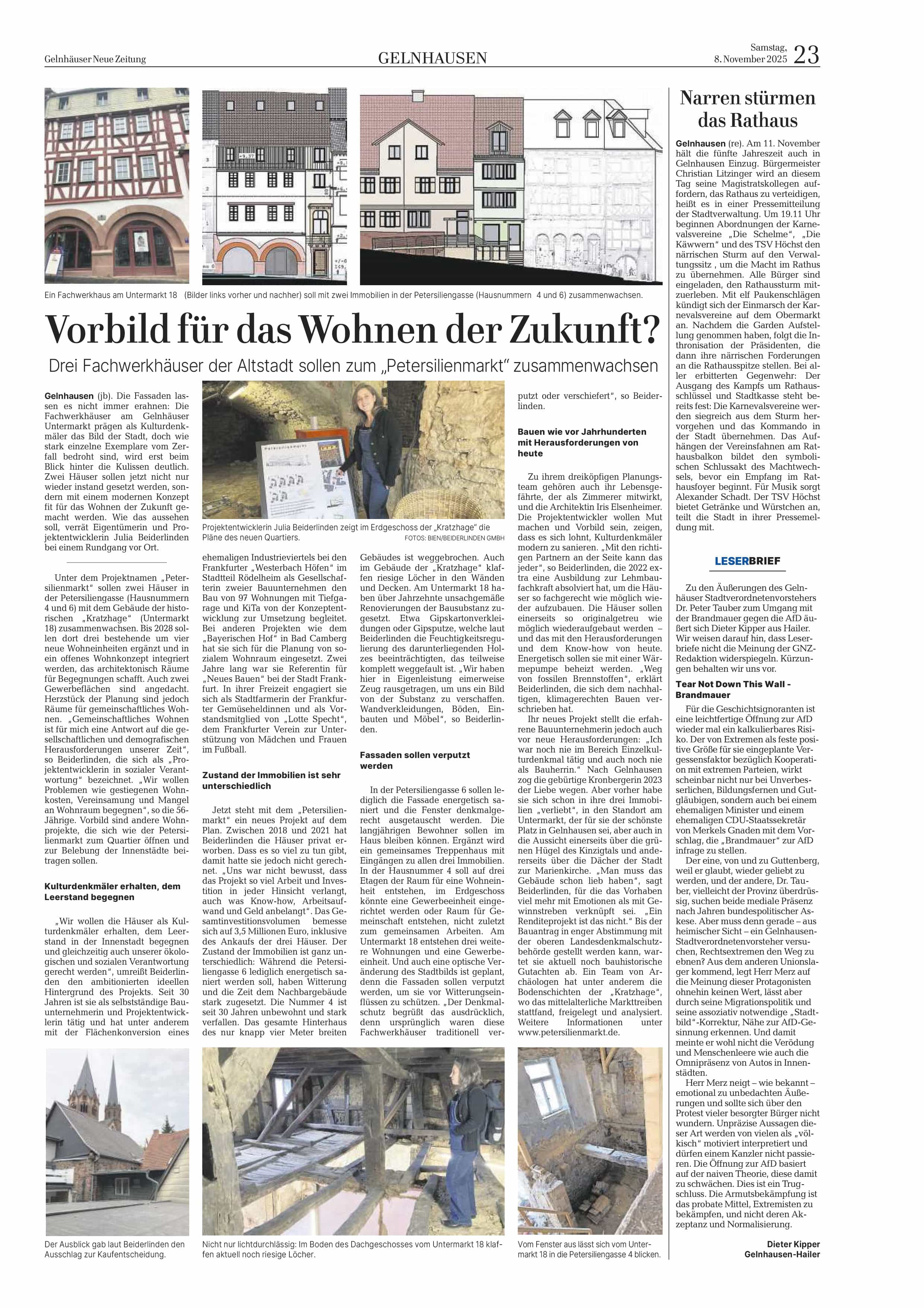 »Die Fassaden lassen es nicht immer erahnen: Die Fachwerkhäuser am Gelnhäuser Untermarkt prägen als Kulturdenkmäler das Bild der Stadt, doch wie stark einzelne Exemplare vom Zerfall bedroht sind, wird erst beim Blick hinter die Kulissen deutlich. Zwei Häuser sollen jetzt nicht nur wieder instand gesetzt werden, sondern mit einem modernen Konzept fit für das Wohnen der Zukunft gemacht werden. Wie das aussehen soll, verrät Eigentümerin und Projektentwicklerin Julia Beiderlinden bei einem Rundgang vor Ort. (...)«